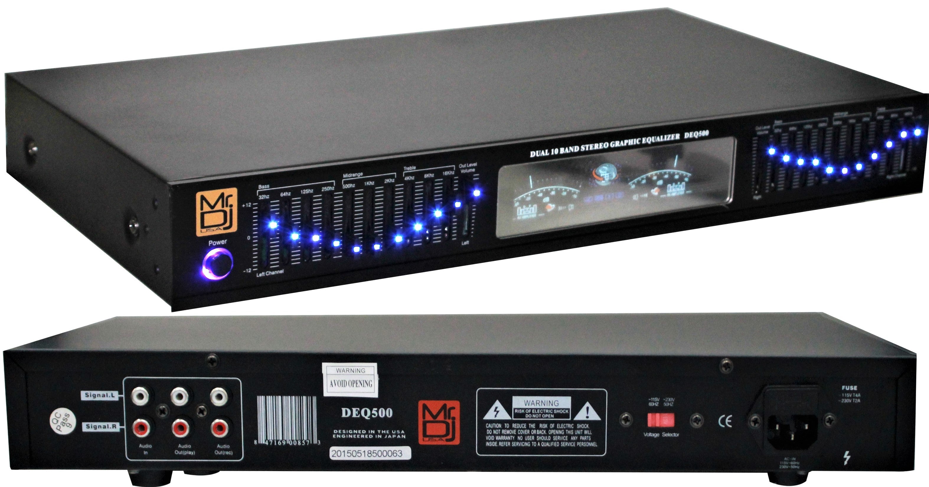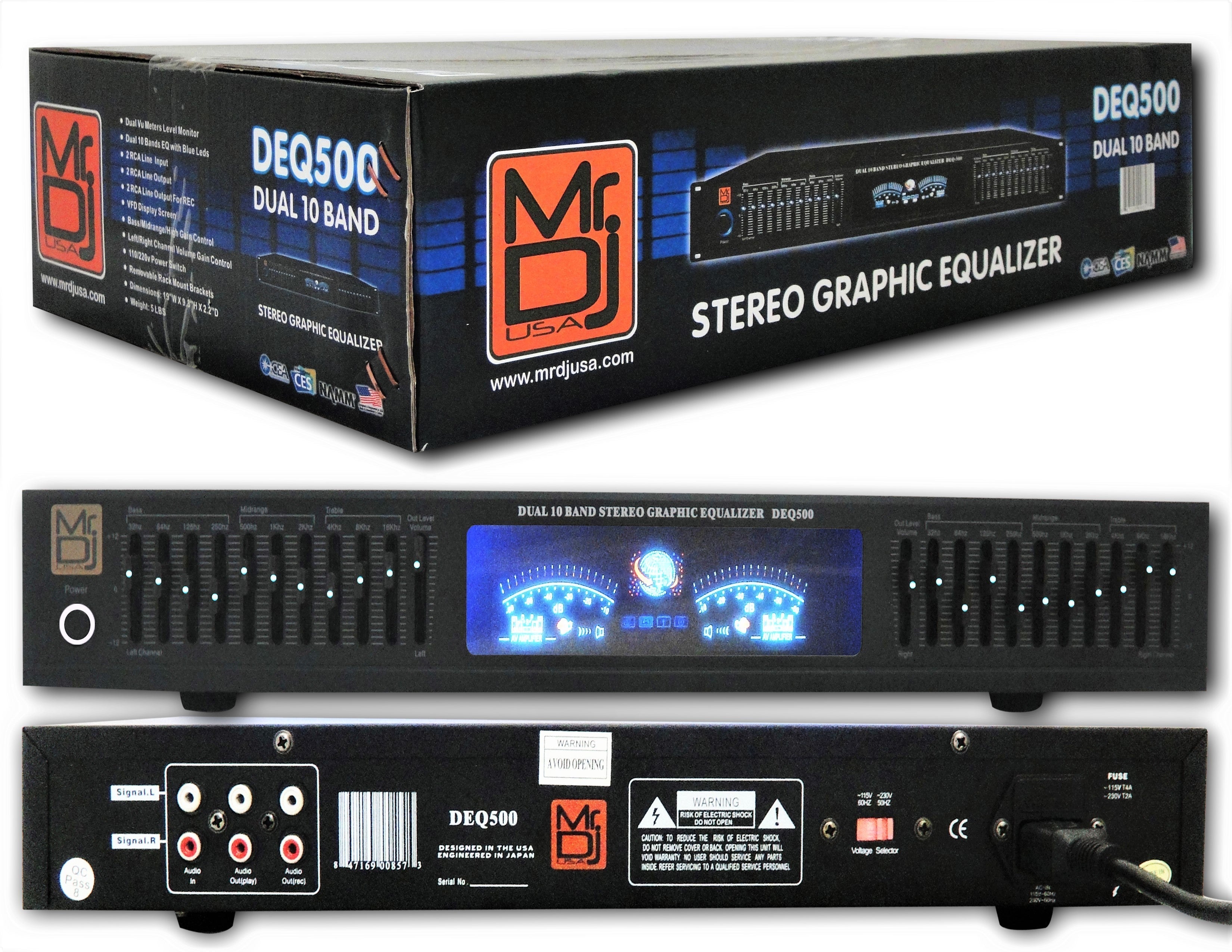 MR DJ DEQ500 19" Rack Mount features ten independently adjustable frequency bands, and MR DJ EQ500 gives you super-precise sonic control with your home stereo system. Far more sophisticated and powerful than your receiver's bass and treble controls, this graphic equalizer lets you fine-tune audio signals to suit your musical taste and also features a dual Vu meters level monitor analyzer display. It doesn't just look cool — seeing the music's frequency content can also help you make suitable sound adjustments.