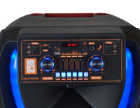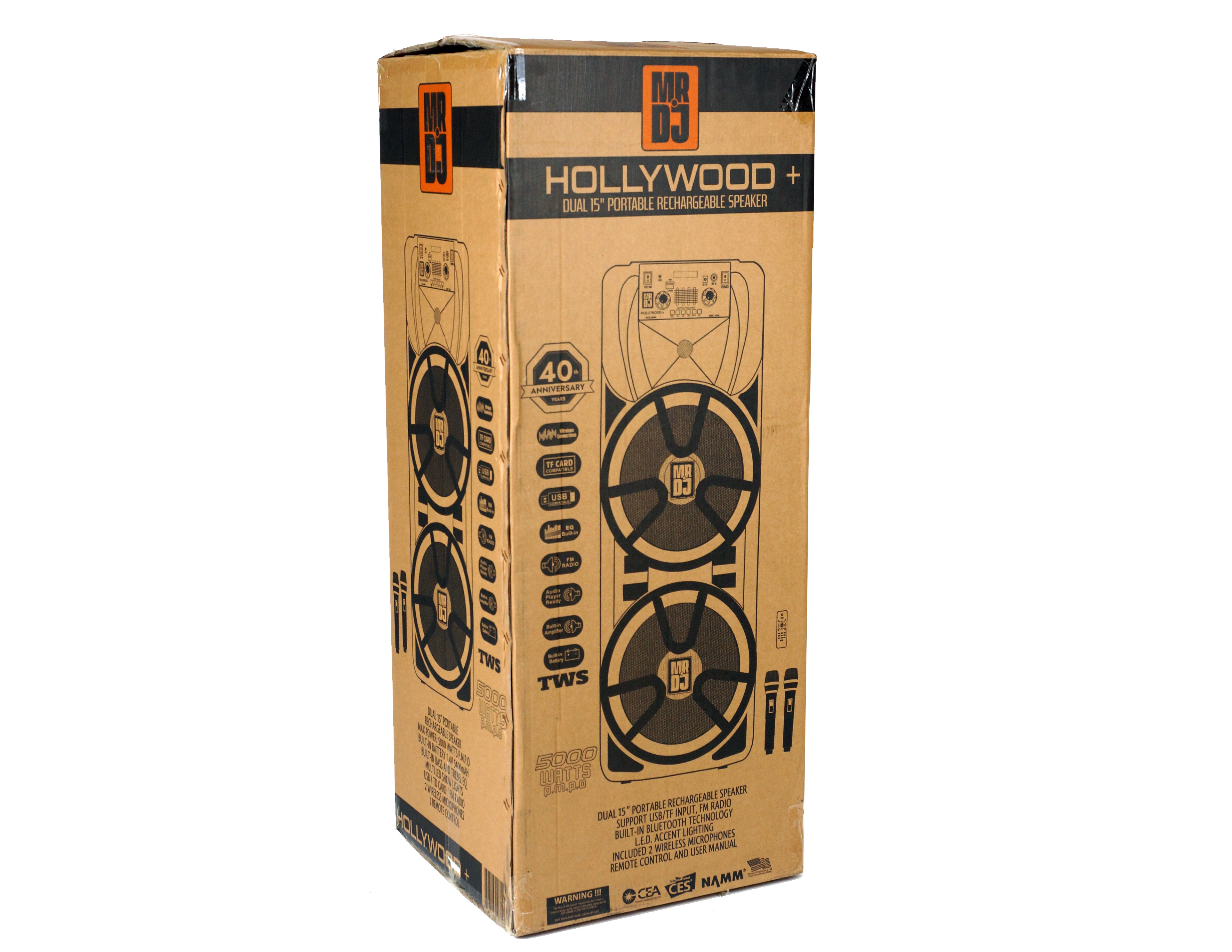 MR DJ HOLLYWOOD+ Dual 15" Rechargeable Portable Bluetooth Karaoke Speaker Party Flame Lights 2 Wireless Microphone, TWS USB FM Radio
