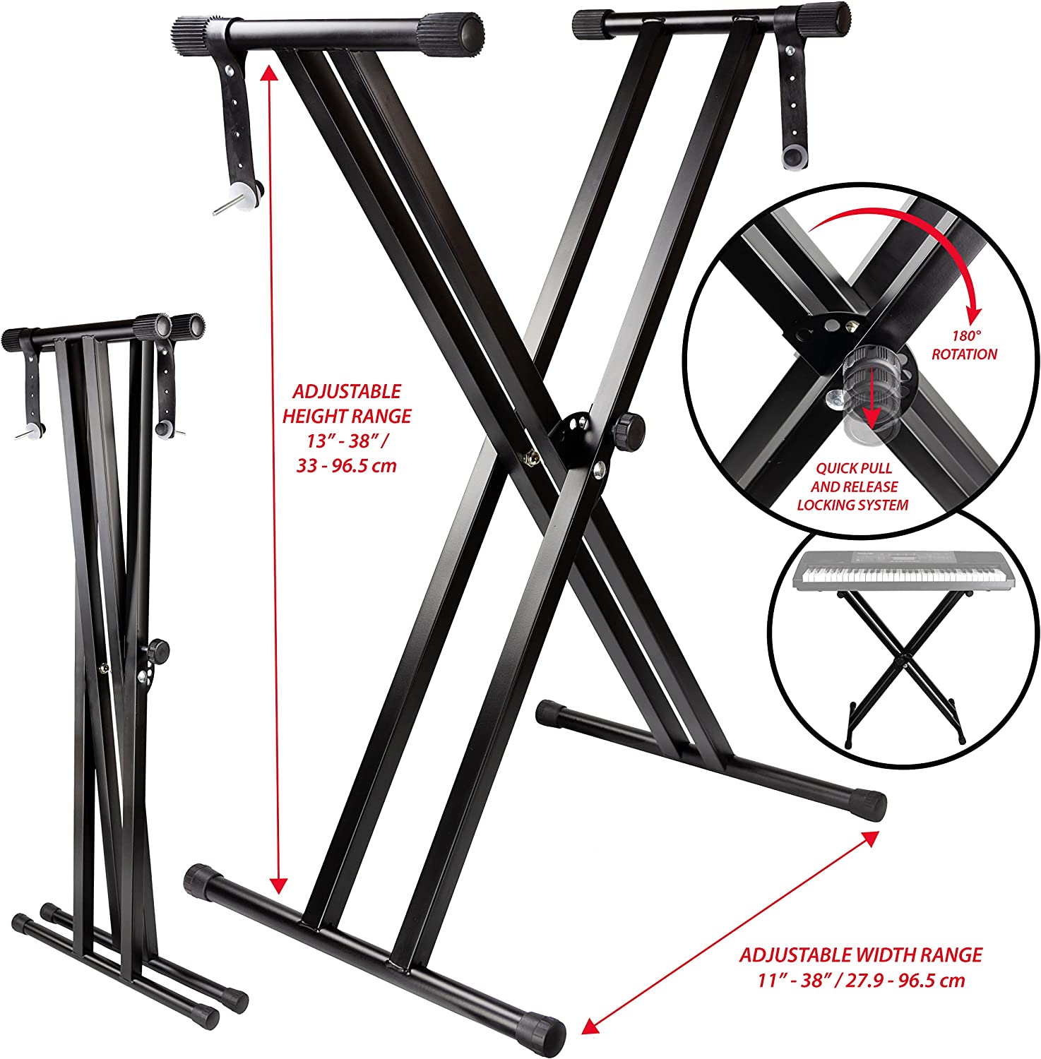 - For Large Keyboards, Additional Locking Positions on Main X-tubes for Extremely Low-Level Usage